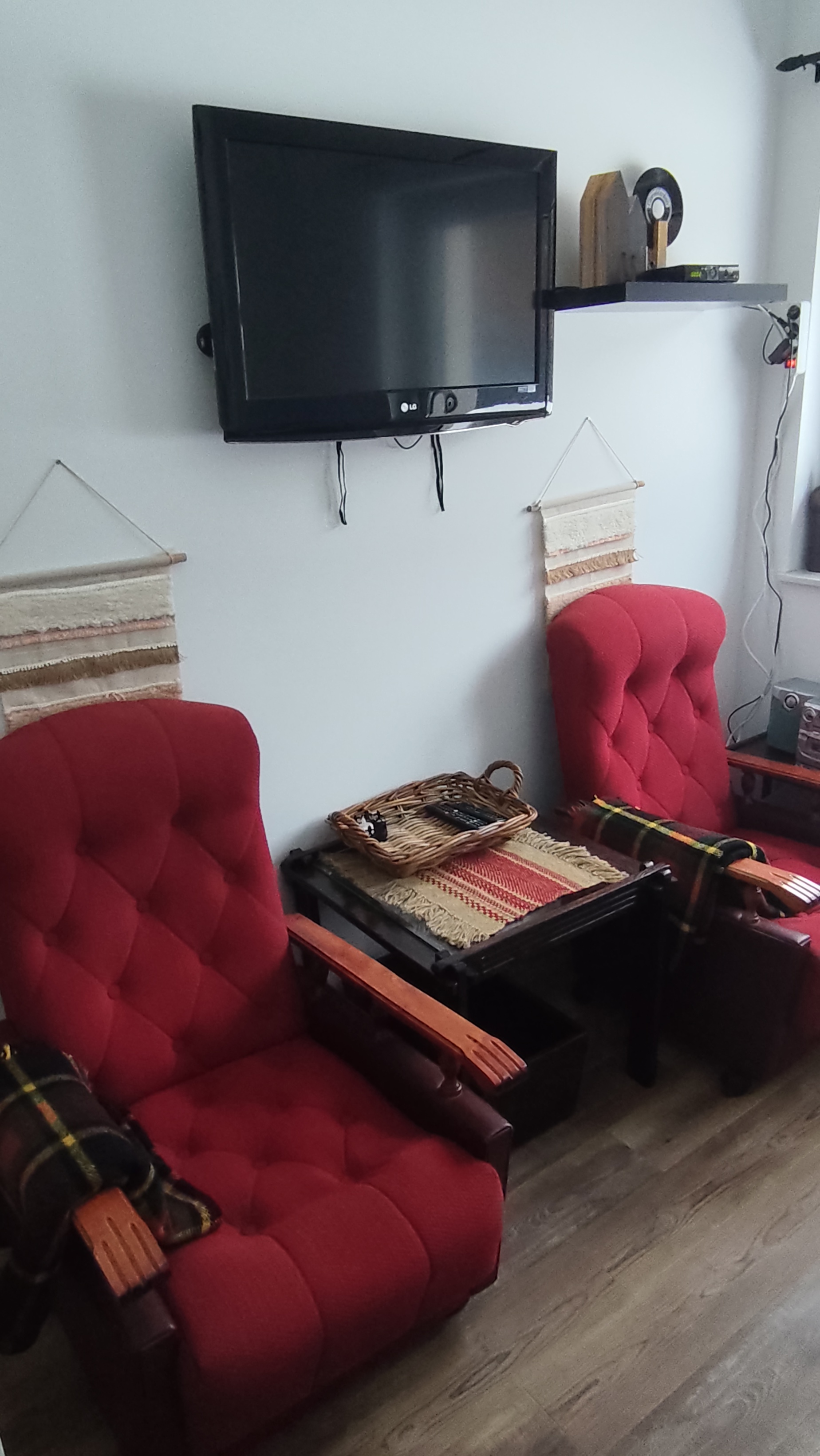 Das Wohn-/Esszimmer ist mit einem Esstisch mit sechs Stühlen, einem bequemen Sofa und Sesseln ausgestattet. Außerdem gibt es ein Radio, einen CD-/DVD-Player und einen Flachbildfernseher. Die Schlafzimmer sind vom Wohnzimmer aus zugänglich. Zwei Schlafzimmer verfügen über ein Doppelbett (1,80 x 2,00 m), Kleiderschränke, Nachttische usw. Das dritte Schlafzimmer ist mit zwei Sesseln und einem Schlafsofa ausgestattet (TV in beiden Schlafzimmern).